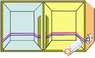 Most Table Lamps and Floor Lamps come with a plug attached. Choose outlets to accommodate the plugs. The outlets are placed anywhere you have tape run. There are two prongs on an outlet; one prong is placed in each side of the tape. These outlets may be installed at anytime. Using the saved Ruler, you can rest the ruler against the wall to know where your wire is under wallpaper. Use your test tool to locate the correct placement of the outlet.