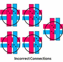 Using (2) brass brads or (1) brass eyelet, connect the tape each side of the strip at all overlaps. THE MOST IMPORTANT PART OF THE CONNECTION IS TO CONNECT THE PINK TAPE TO PINK TAPE, AND THE BLUE TAPE TO BLUE TAPE. Connecting it incorrectly will short your system.