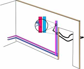 Start by holding the ruler flat against the lower right side wall resting on the floor. Using the ruler as your guide, draw a pencil line around the perimeter of each room. Suggestion: label the ruler for future use as the guide for wiring.